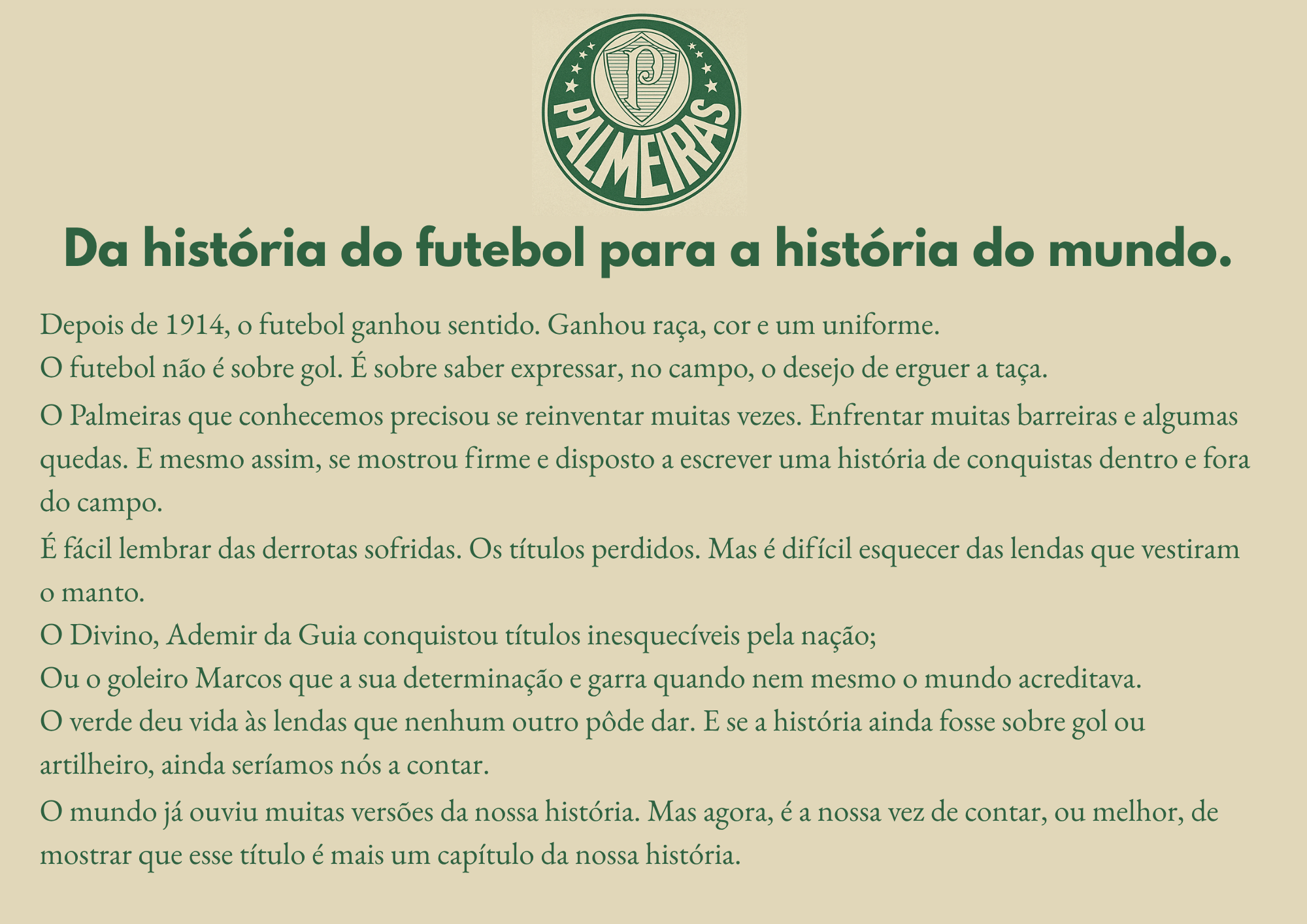 Produção autoral com foco em aprimorar a visão criativa, por meio de um long copy inspirado na trajetória do Palmeiras em busca do título do Mundial de Clubes.